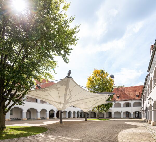 Im vorderen Hof sind Unterstellmöglichkeiten für die Dienstfahrzeuge entstanden. Als Kontrast zur massiven Bausubstanz wurden die neuen Carportelemente als leichte Membrandachkonstruktionen ausgeführt. Ein großer zentraler Hauptschirm bietet 16 PKW-Stellplätzen ein Dach. Im südwestlichen und im nordöstlichen Hofbereich wurden jeweils 4-5 weitere Parkplätze mit zwei Nebenschirmen überdacht. Die Innenhofüberdachungen bestehen jeweils aus zwei eingespannten Stahl-Zentralmasten. Von diesen Zentralmasten gehen im oberen Drittel horizontale Hauptstreben ab, welche die Membrane trichterförmig aufspannen.